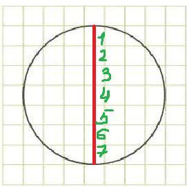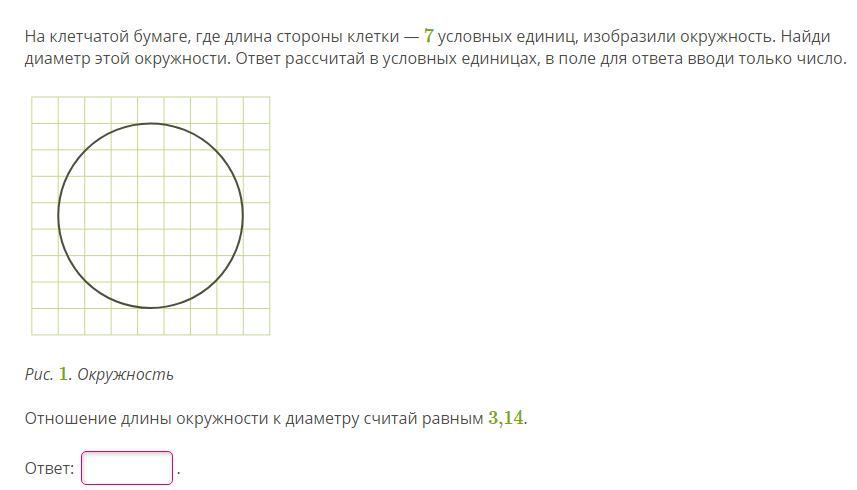 На клетчатой бумаге, где длина стороны клетки — 7 условных единиц, изобразили окружность. Найди диаметр этой окружности. Ответ рассчитай в условных единицах, в поле для ответа вводи только число.