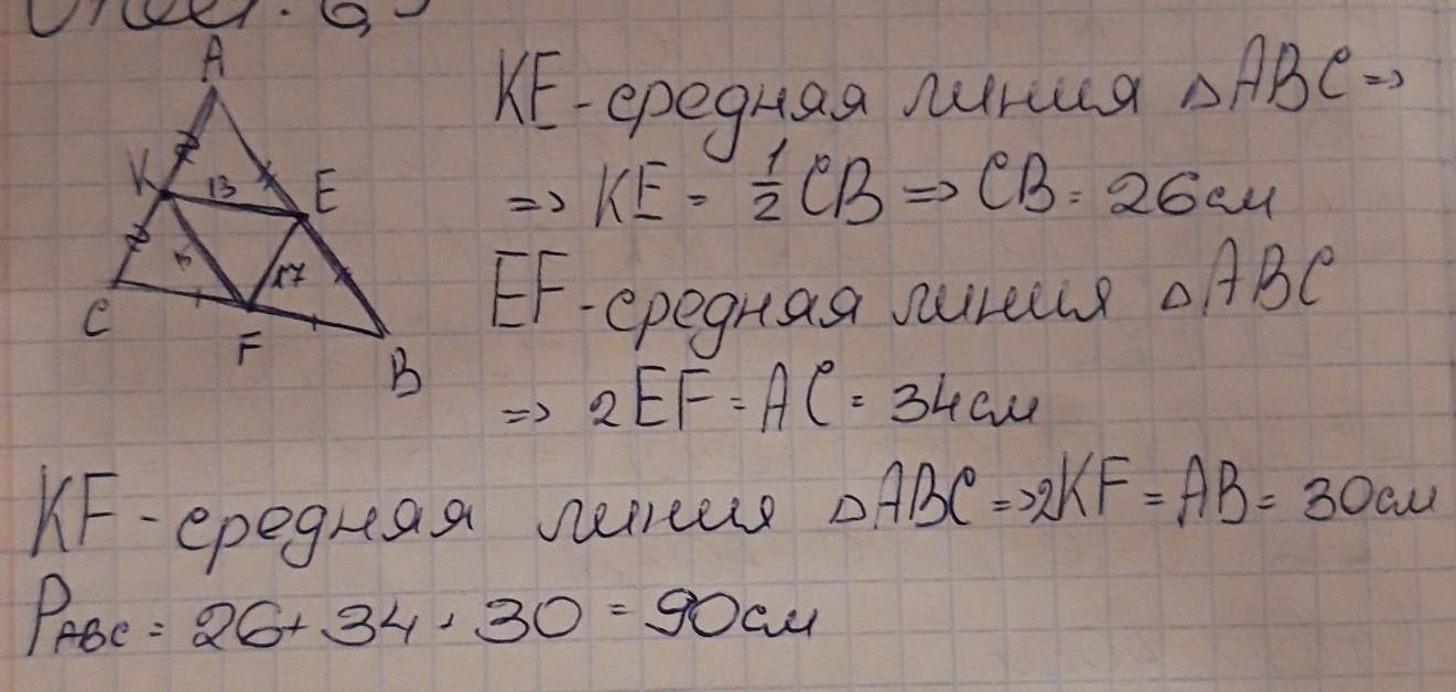 ПОМОГИТЕ ПОЖАЛУЙСТА! дам 45 баллов В треугольнике ABC точки E,F,K середины сторон AB BC AC найти периметр треугольника ABC если KF=15см, EK=13см, EF=7см. Напишите пожалуйста понятно