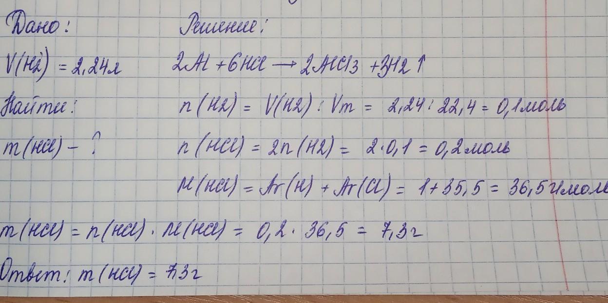 Определите массу соляной кислоты при взаимодействии с алюминием при нормальных условиях 2,24 л водород