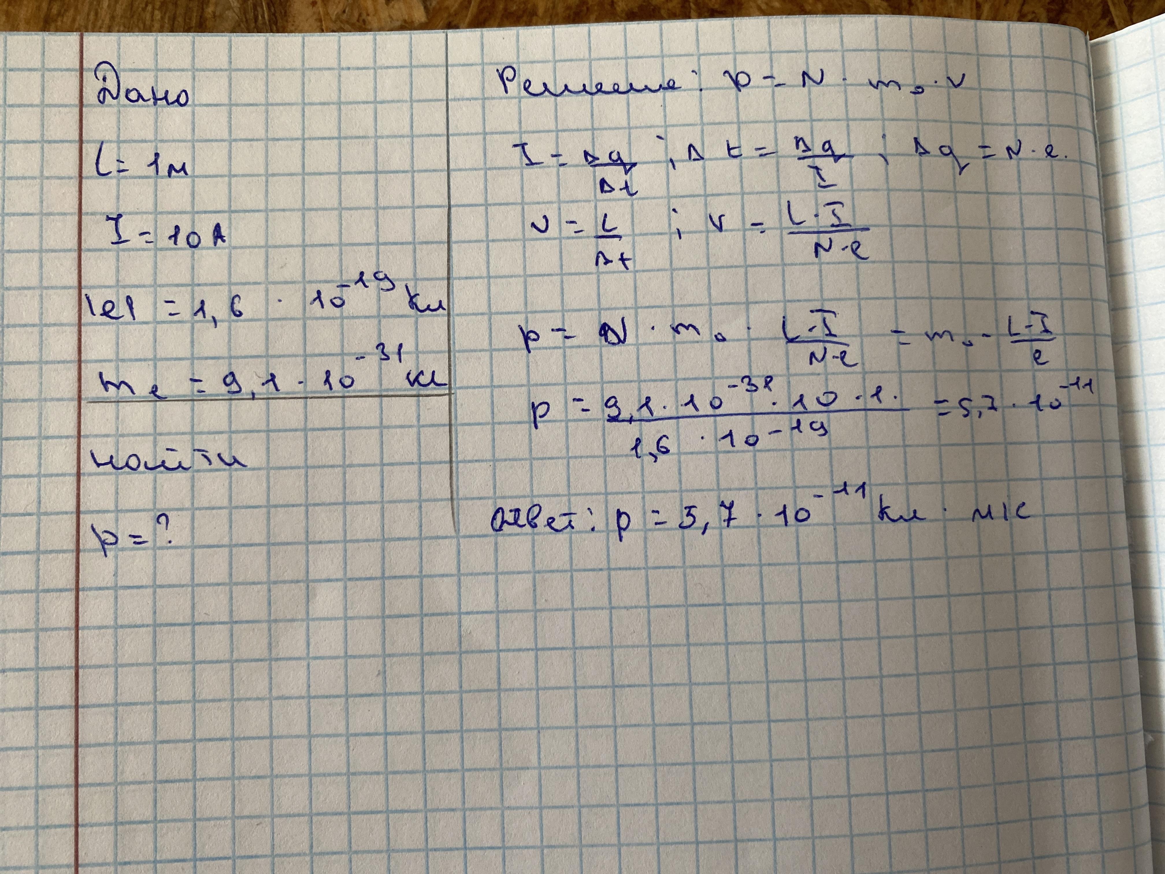 По прямому проводнику длиной l = 1 м течет ток I = 10 А. Определите средний суммарный импульс электронов в проводнике. Заряд электрона |e| = 1,6 × 10^-19 Кл, масса m е =9,1 × 10^-31 кг.