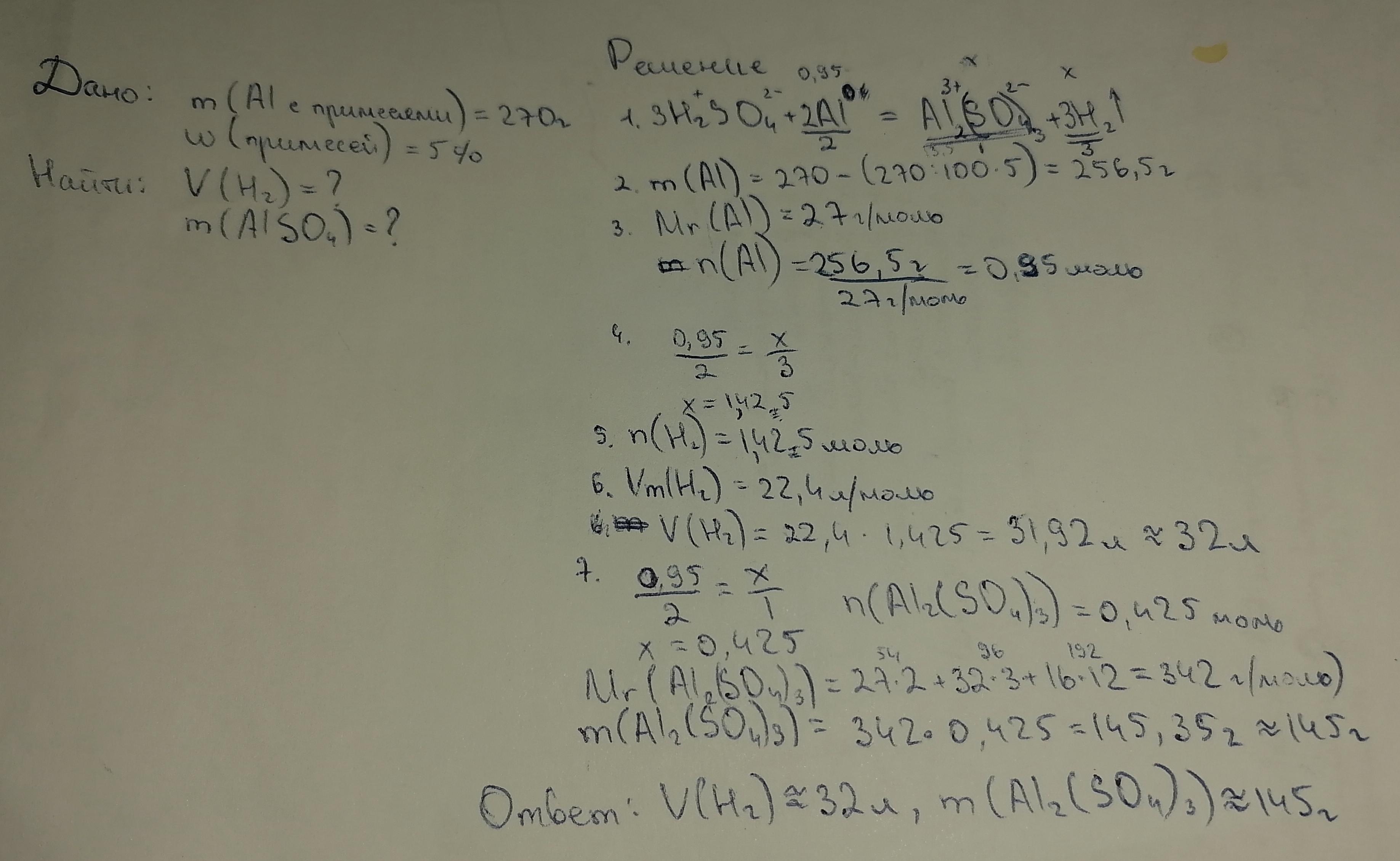 Какой объем водорода и какую массу соли можно получить при взаимодействии серной кислоты с 270г алюминия, содержащего 5% примесей