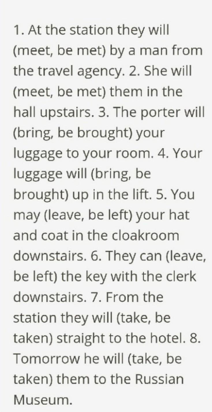 1 be met 2 meet 3 bring 4 be brought 5 leave 6 leave 7 be taken 8 take