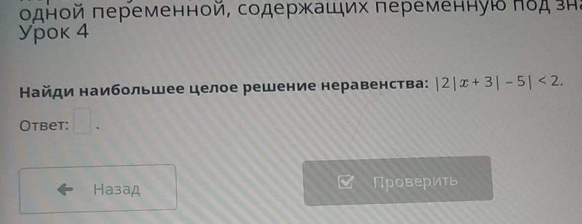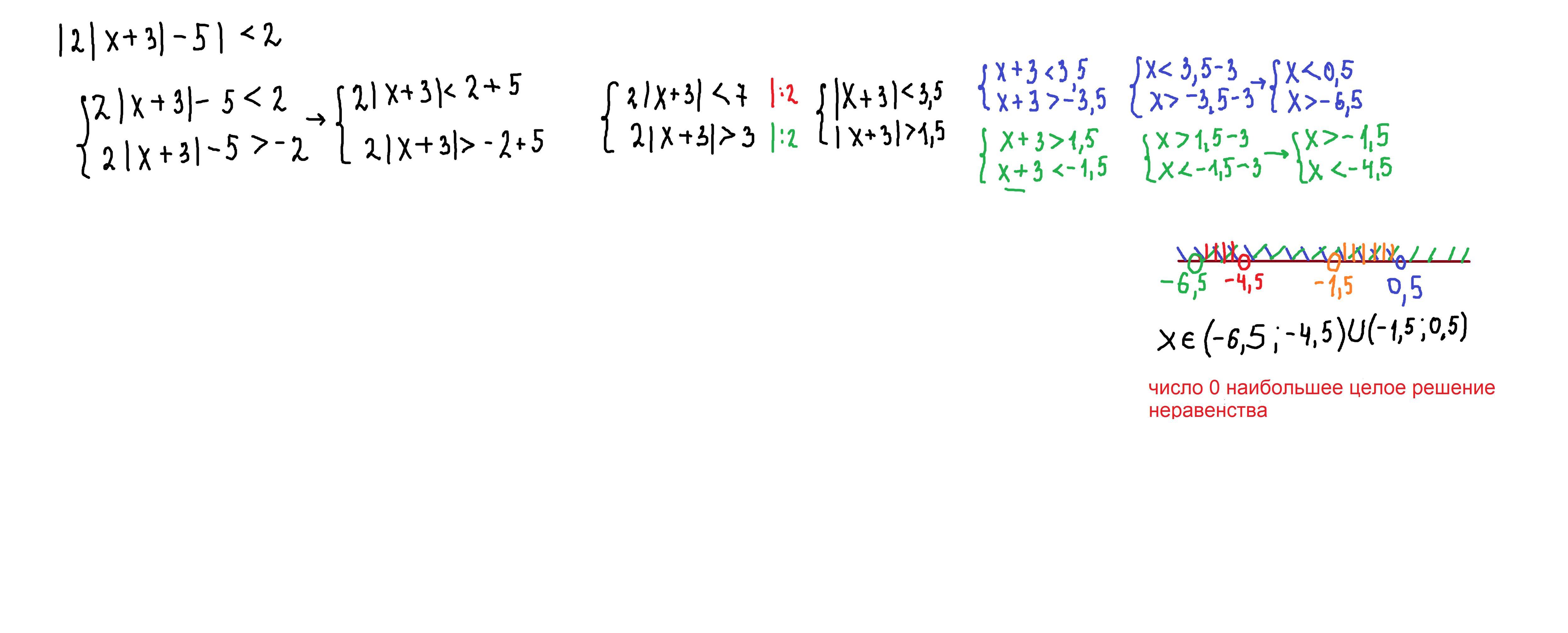 Найди наибольшее целое решение неравенства: |2| x+3| - 5| < 2.