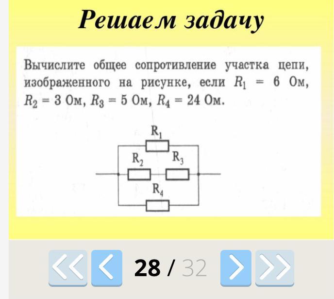 1/R=(1/R1)+(1/(R2+R3))+(1/R4) = 1/6 + 1/(3+5) + 1/24 = приводим к общему знаменателю (24) = 4/24+3/24 + 1/24 = 8/24. (Но это значение 1/R).