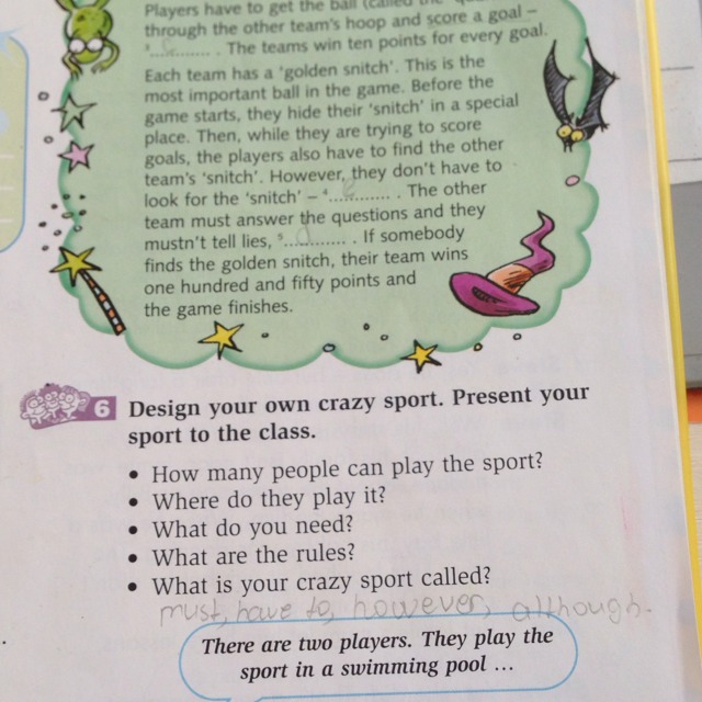 Срочно!!! 40 баллов!!!! Сделайте номер 6, надо придумать свой вид спорта и написать о нем по вопросам и использовать must, have to, however, although!!!