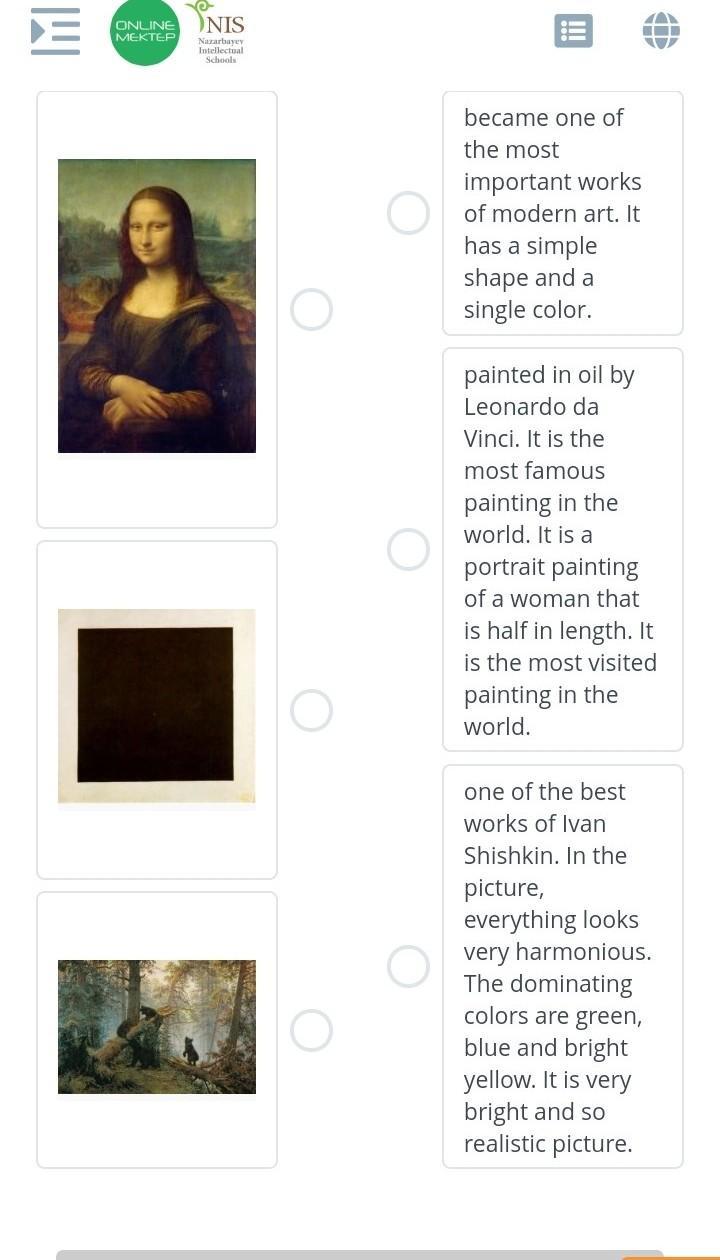 Paintings talk Read descriptions and choose a suitable picture, помогите пожалуйста