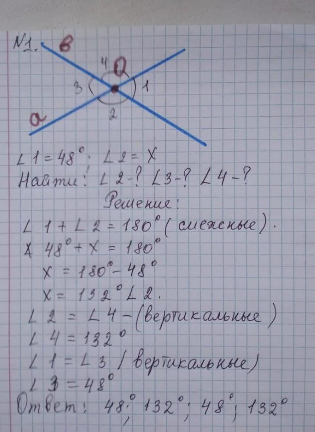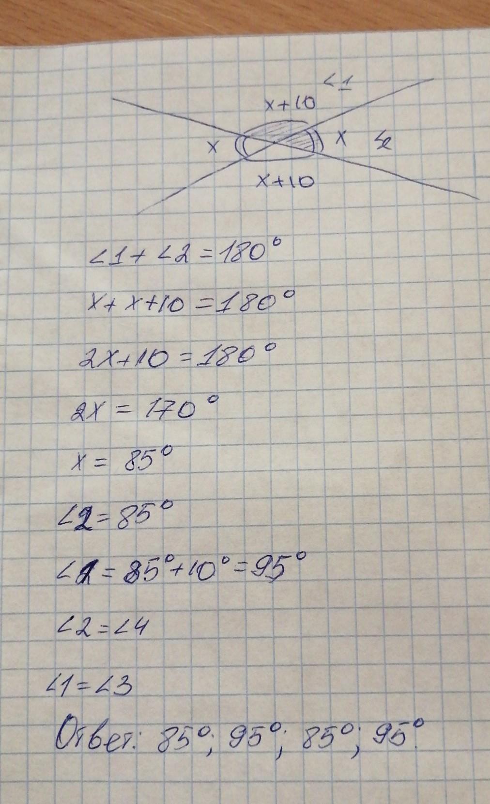 задача : Две прямые пересекаются и образуют четыре угла . Найдите все углы , если известно , что угол <1 на 10° больше угла <2.