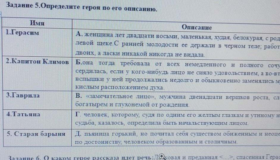 Задание 6. Окаком герое рассказа идет речь: Тасковая и преданная <...>, спасенная Герасимом от