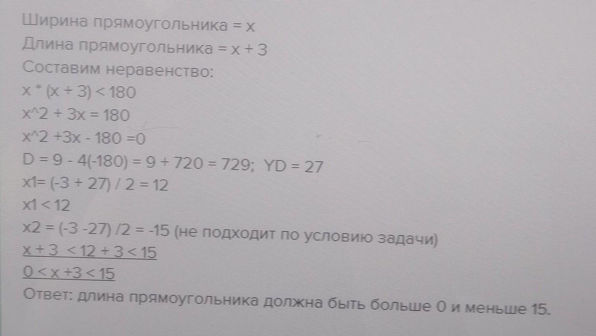 Сторона прямоугольника на 3 см меньше другой, а площадь равна 180 см². Найти стороны и периметр прямоугольника?