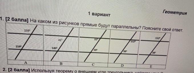 Е - сумма углов должна бить 180°. Так как ето не виполняется, то прямие не паралельние