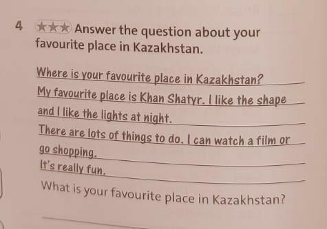 там где написано What is your favourite place in Kazakhstan там надо написать твоё любимое место в Казахстане