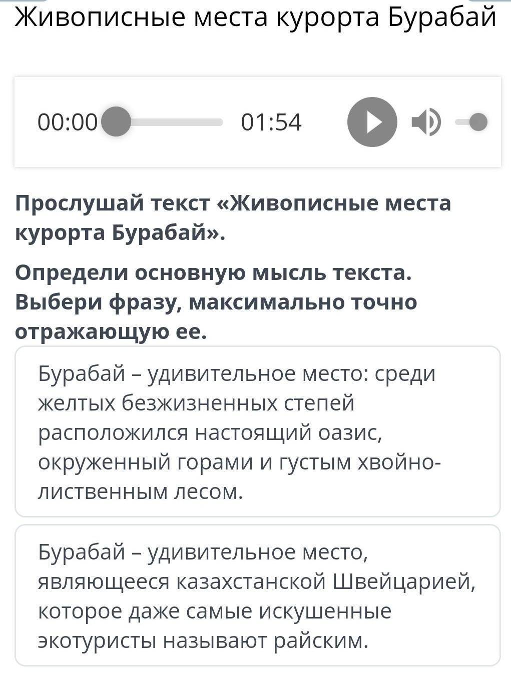 Основная мысль текста:Показать,и рассказать нам про красоту и удивительные места Бурабай.