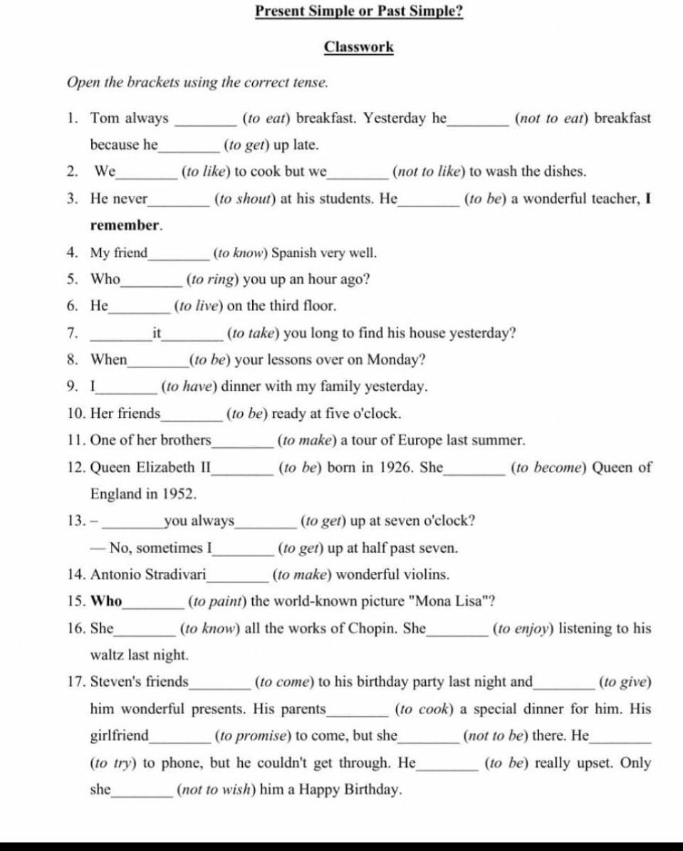 17) came, gave, cooked, promised, wasn’t, tried, was, didn’t wish