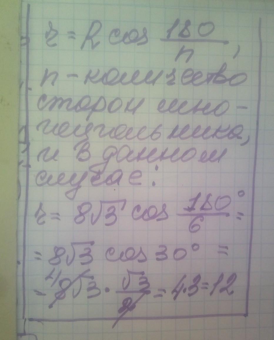 Радіус кола описаного навколо правильного шестикутника дорівнює 8√3. Знайте радіус вписаного кола.