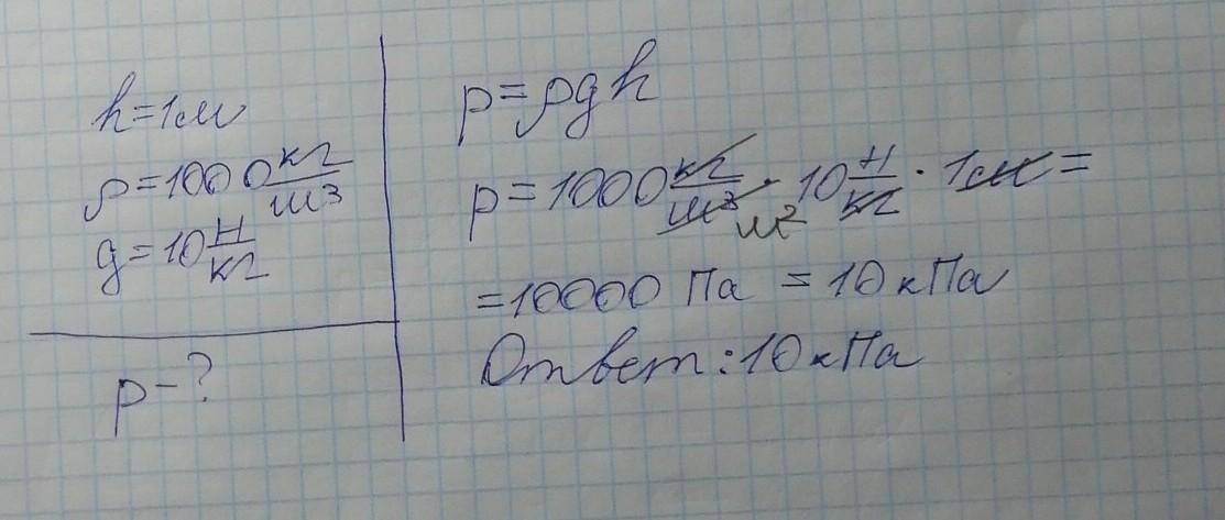 Вычислите давление воды на глубине 1 м. Плотность воды ρ = 1000 кг/м3, примите g = 10 Н/ кг.