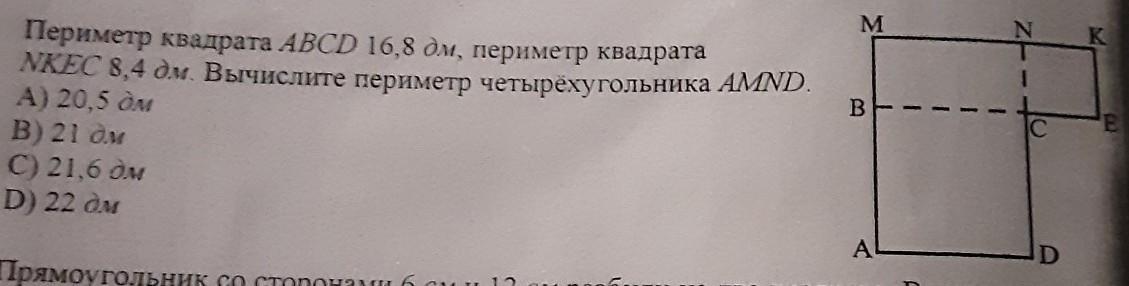 Р(AMND) = P(ABCD)+P(NKEC)/2 = 16.8 + 8.4/2 = 16.8+ 4.2 =21 дм.
