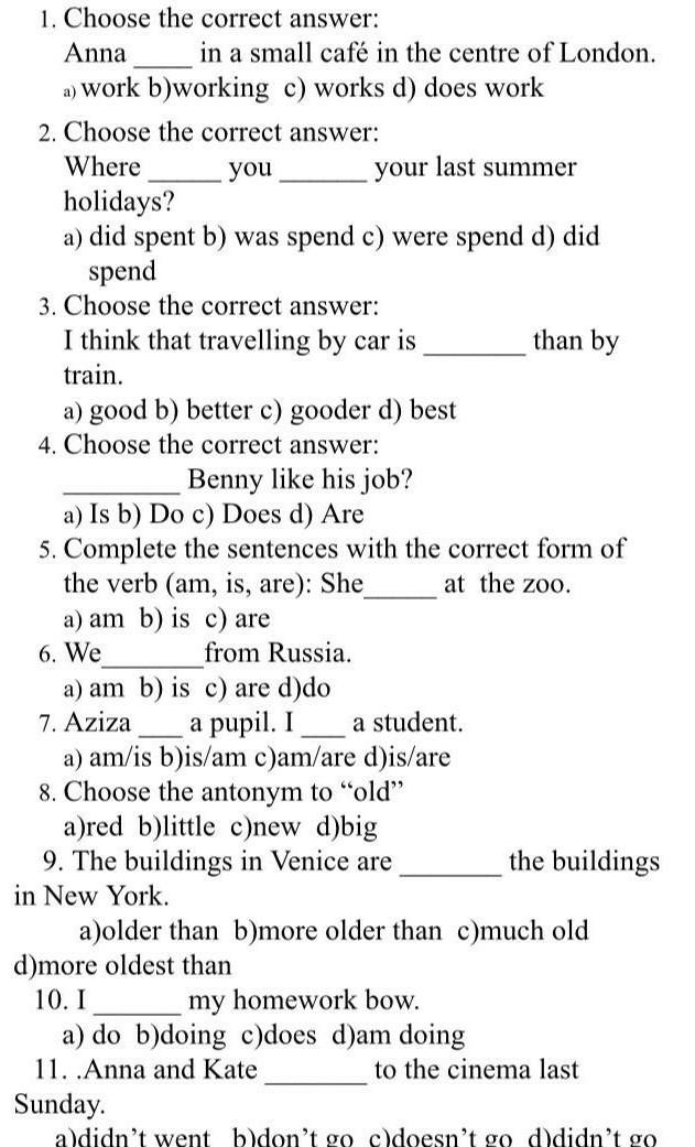 Test Grade 6 1. Choose the correct answer: Anna in a small café in the centre of London. a) work b)working c) works d) does work 2. Choose the correct answer: Where you your last summer holidays? a) did spent b) was spend c) were spend d) did spend 3. Choose the correct answer: I think that travelling by car is train. than by a) good b) better c) gooder d) best 4. Choose the correct answer: Benny like his job? a) Is b) Do c) Does d) Are 5. Complete the sentences with the correct form of the verb (am, is, are): She a) am b) is c) are at the zoo. 6. We from Russia. a) am b) is c) are d)do 7. Aziza a) am/is b)is/am c)am/are d)is/are 8. Choose the antonym to "old" a)red b)little c)new d)big 9. The buildings in Venice are in New York. a pupil. I a student. the buildings a)older than b)more older than c)much old d)more oldest than 10. I a) do b)doing c)does d)am doing 11. .Anna and Kate Sunday. a)didn't went b)don't go c)doesn't go d)didn't go 12. It's snowy - please drive a)carefully b)easily c)scary d)interesting my homework bow. to the cinema last