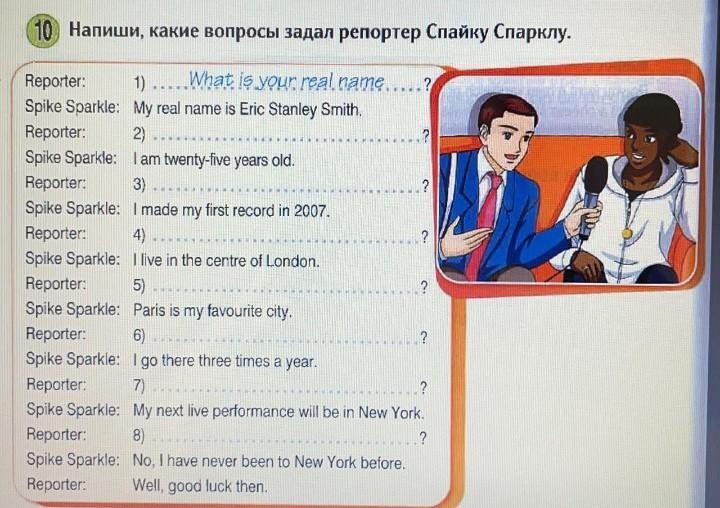 10 Напиши, какие вопросы задал репортер Reporter: С 1) .... What is your real name.....? Spike Sparkle: My real name is Eric Stanley Smith, Reporter: 2) Spike Sparkle: lam twenty-five years old. Reporter: 3) Spike Sparkle: I made my first record in 2007. Reporter: 4) Spike Sparkle: I live in the centre of London. Reporter: 5) Spike Sparkle: Paris is my favourite city. Reporter: 6 Spike Sparkle: I go there three times a year. Reporter: 7) Spike Sparkle: My next live performance will be in New York. ? ? Reporter 8) Spike Sparkle: No, I have never been to New York before. Reporter: Well, good luck then ? ? ?