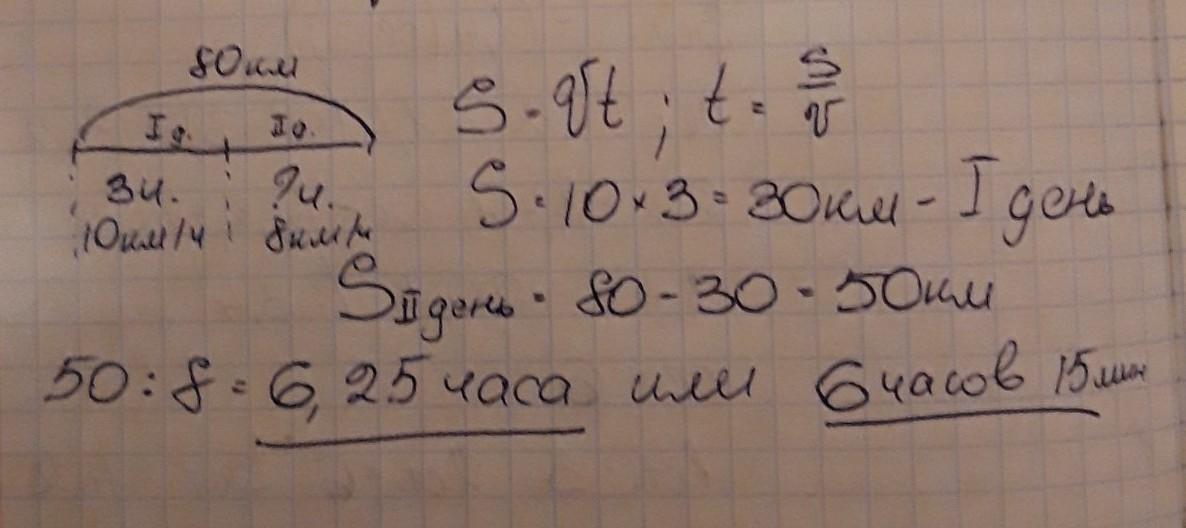 5. Всадник проехал за 2 дня 80 км. В первый день он ехал 3 ч со скоростью 10 км/ч, во