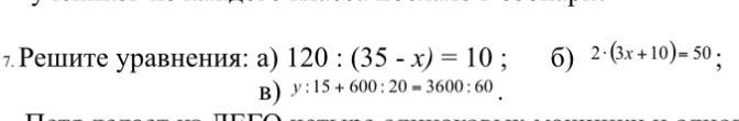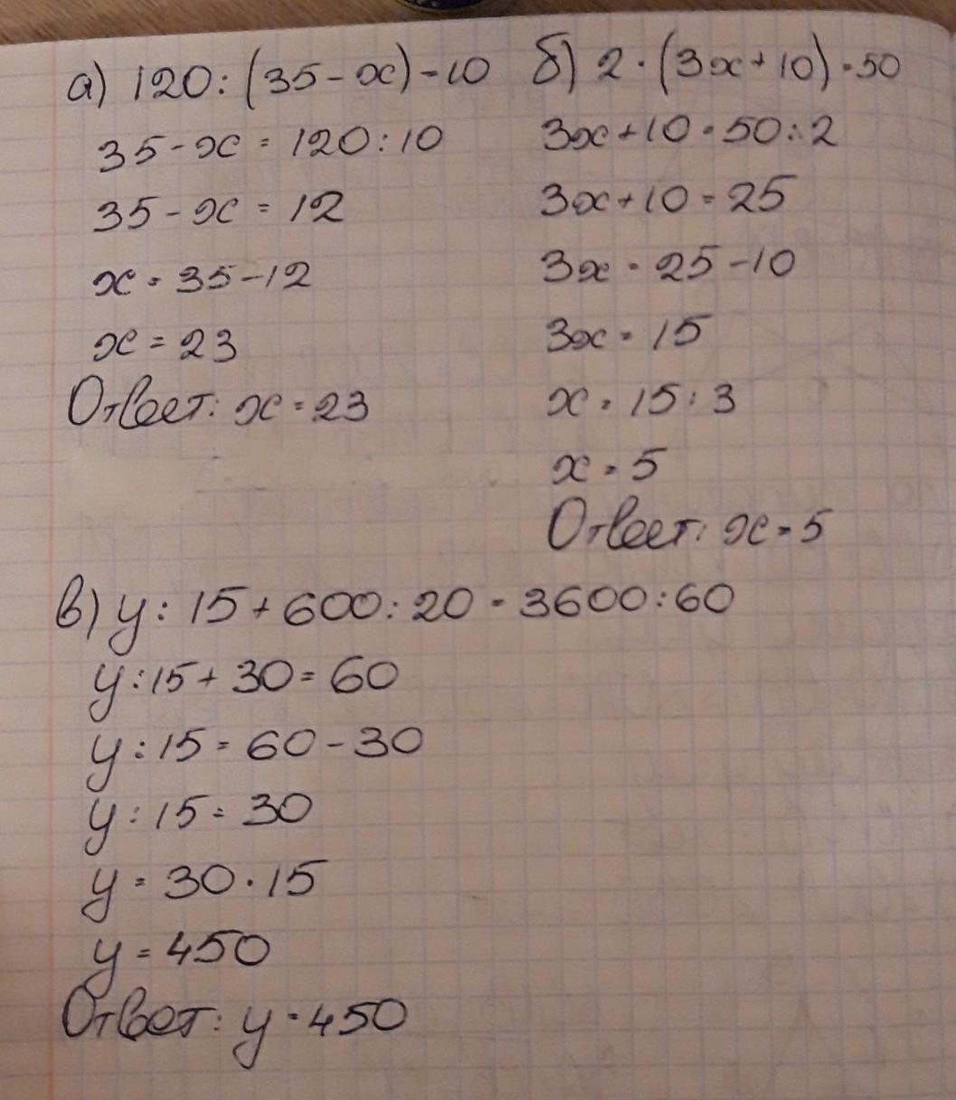 а)120:(35-х)=10 б)2*(3х+10)=50 в)у:15+30=6