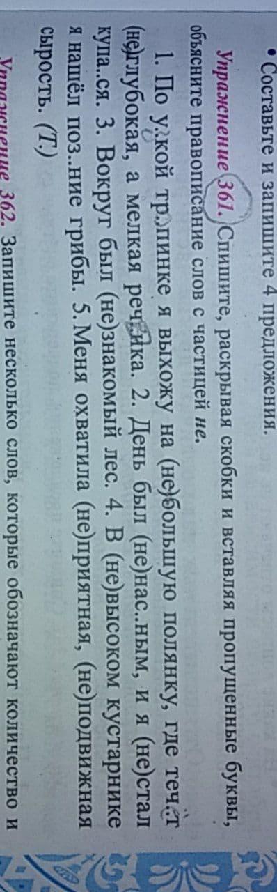 По узкой тропинке я выхожу на небольшую полянку, где течет не глубокая, а мелкая речонка. 2. День был ненастным, и я не стал купаться. 3. Вокруг был незнакомый лес. 4 В невысоком кустарнике я нашел поздние грибы. 5. Меня охватила неприятная , неподвижная сырость.