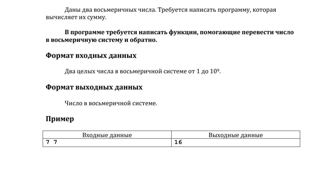 Не, не, тут всё, конечно верно, но вы не поняли задание, я очень благодарен за ваш труд, но суть в том, что можно было бы вводить любые числа помимо 7 7 в отведённом диапазоне и программ переводить эти числа в восьмеричную систему.