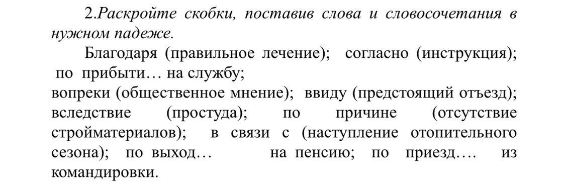 Благодаря правильному лечению; согласно инструкции; по прибытию на службу; вопреки общественному мнению; ввиду предстоящего отъезда; вследствие простуды; по причине отсутствия стройматериалов; в связи с наступлением отопительного сезона; по выходу на пенсию; по приезду из командировки.