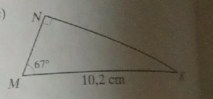 т.к. треугольник MNK прямоугольный и уг.N = 90°, уг.М = 67°, имеем: