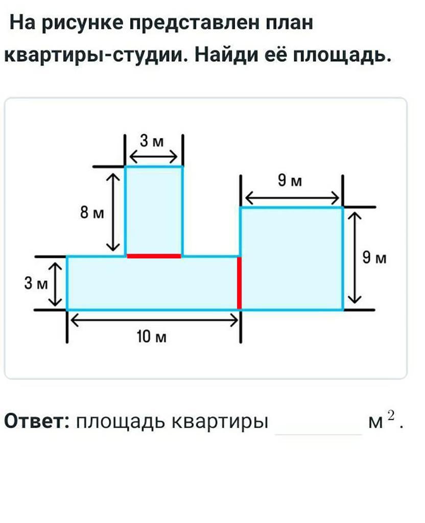 Разделим фигуру на два прямоугольника и квадрат, как показано на рисунке. Теперь найдем площадь каждой фигуры.