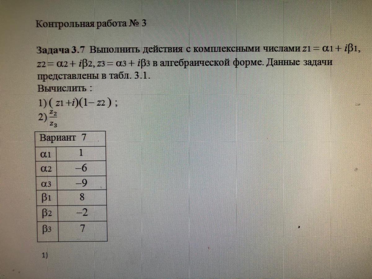z_1=1+8i\ \ ,\ \ z_2=-6-2i\ \ ,\ \ z_3=-9+7i\\\\\\1)\ \ (z_1+i)(1-z_2)=(1+8i+i)(1+6+2i)=(1+9i)(7+2i)=\\\\=7+2i+63i+18i^2=7+65i-18=-11+85i\\\\\\2)\ \ \dfrac{z_2}{z_3}=\dfrac{-6-2i}{-9+7i}=\dfrac{-(6+2i)(-9-7i)}{(-9+7i)(-9-7i)}=\dfrac{(6+2i)(9+7i)}{-(-9+7i)(9+7i)}=\\\\\\=\dfrac{54+42i+18i+14i^2}{-(49i^2-81)}=\dfrac{40+60i}{-(-49-81)}=\dfrac{20\, (2+3i)}{130}=6,5\cdot (2+3i)