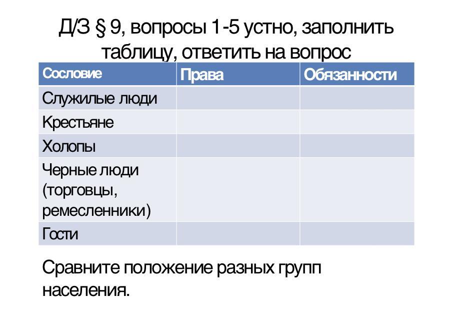 Обязанности: платили подати; беспрекословное подчинение господину; не имели прав.