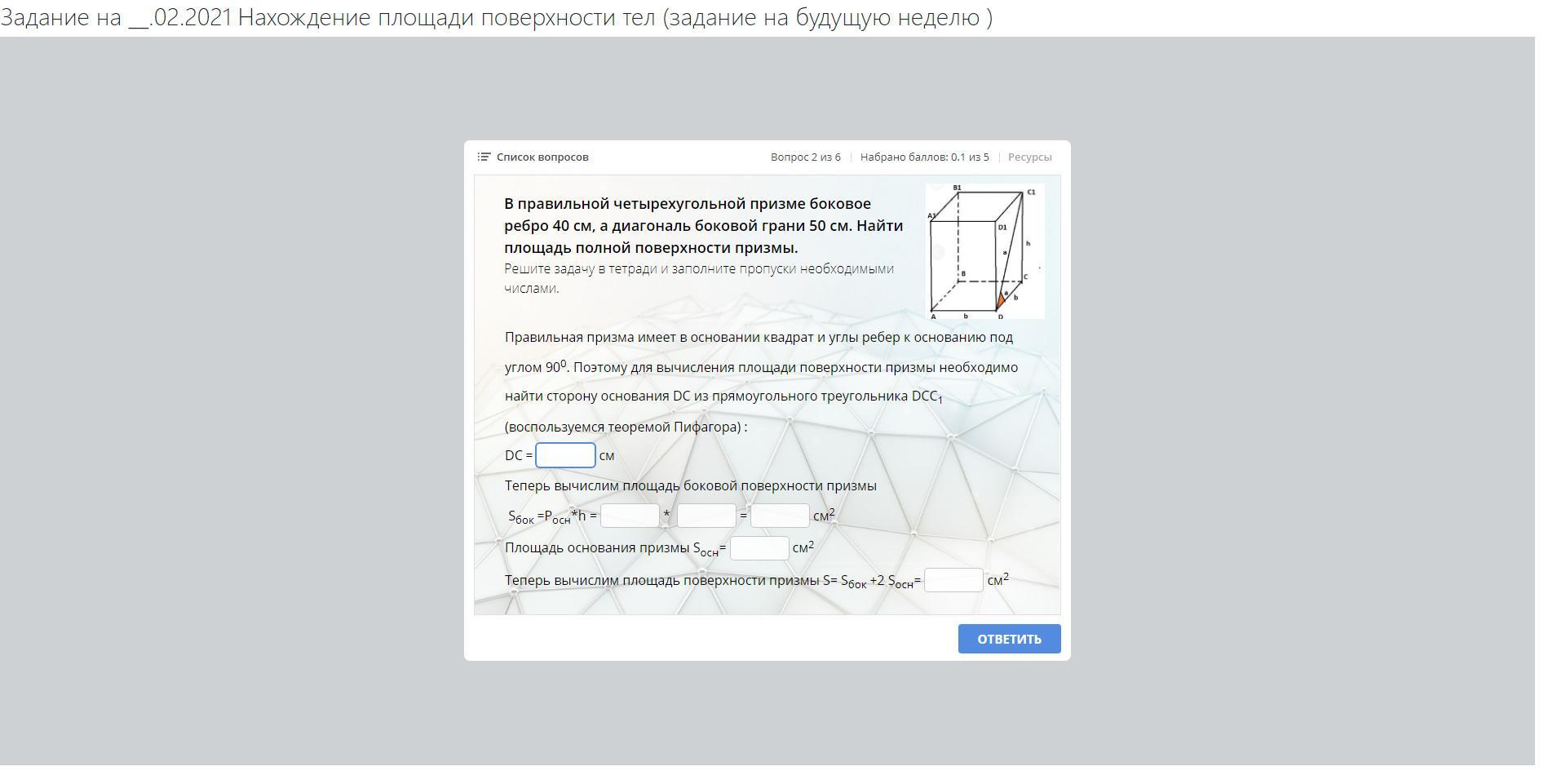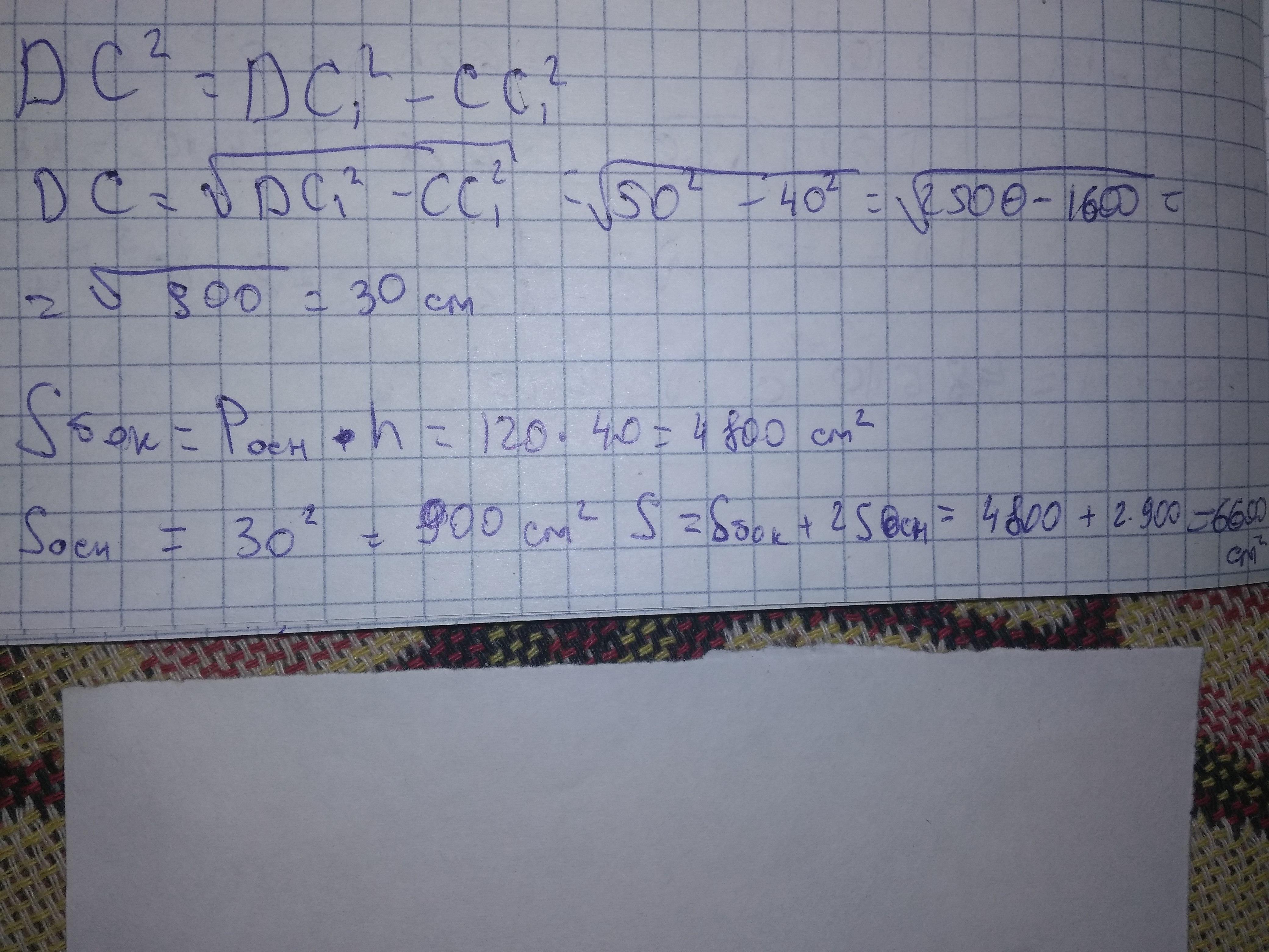 В правильной четырехугольной призме боковое ребро 40, а диагональ боковой грани 50.Найдите площадь полной поверхности призмы.