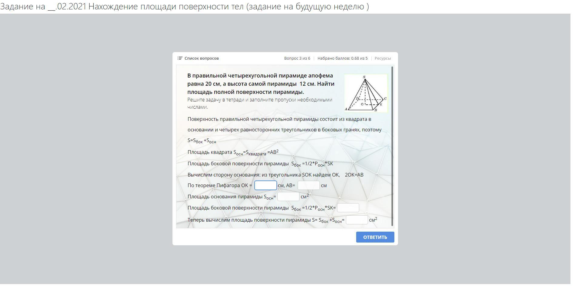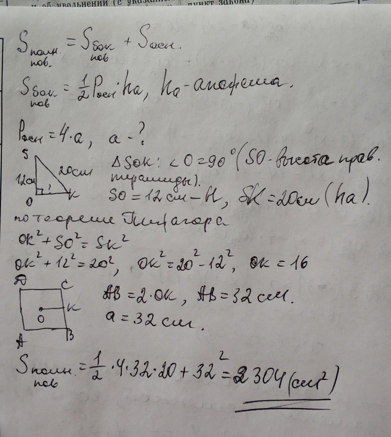 В правильной четырехугольной пирамиде апофема равна 20 а высота самой пирамиды 12.Найдите площадь полной поверхности пирамиды.