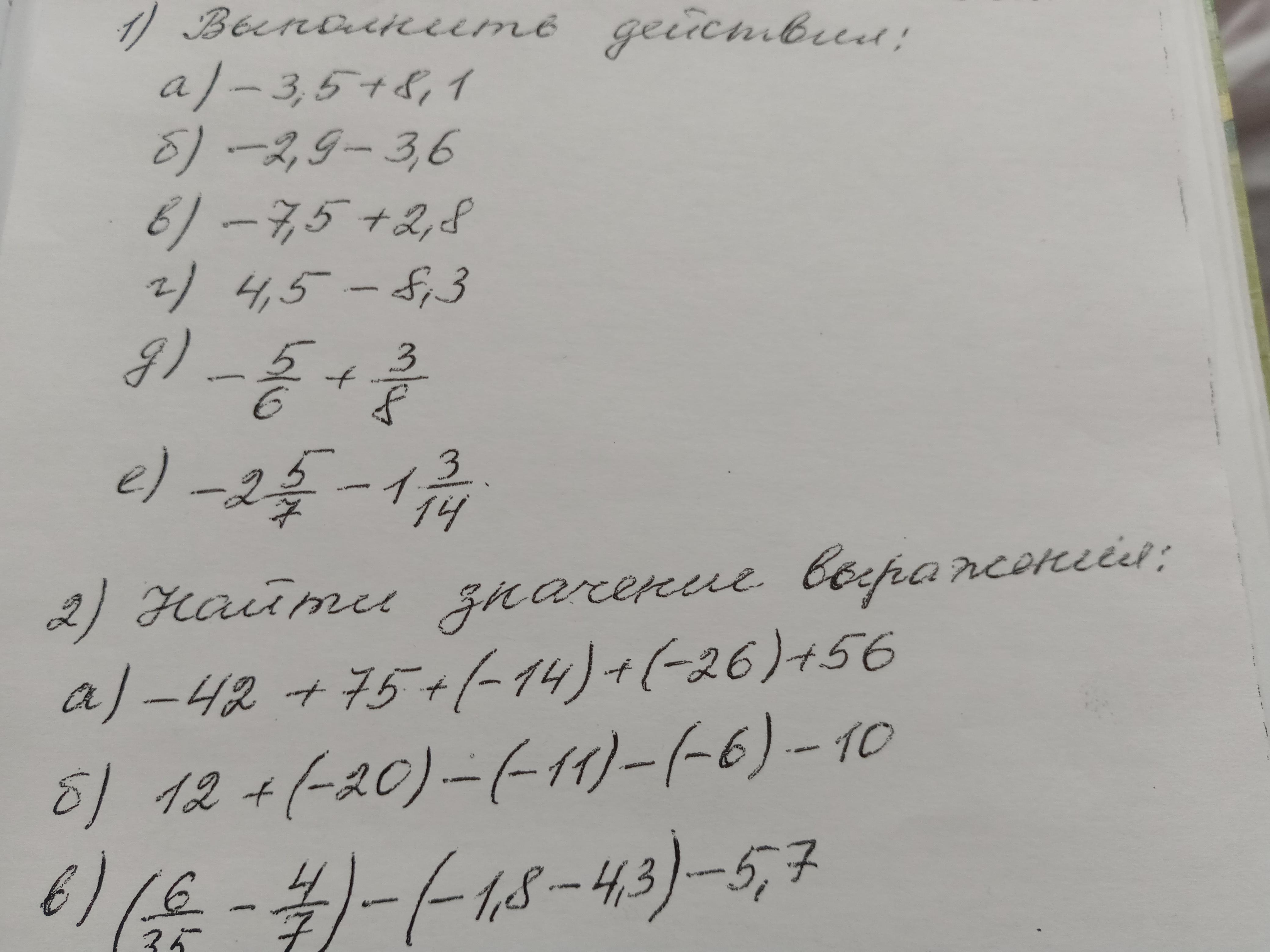 в) (6/35 - 4/7) - (-1,8-4,3)-5,7= 0.