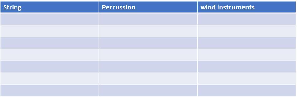 String: guitar, bandyra, banjo, balalayka, harp, lute, siltar.