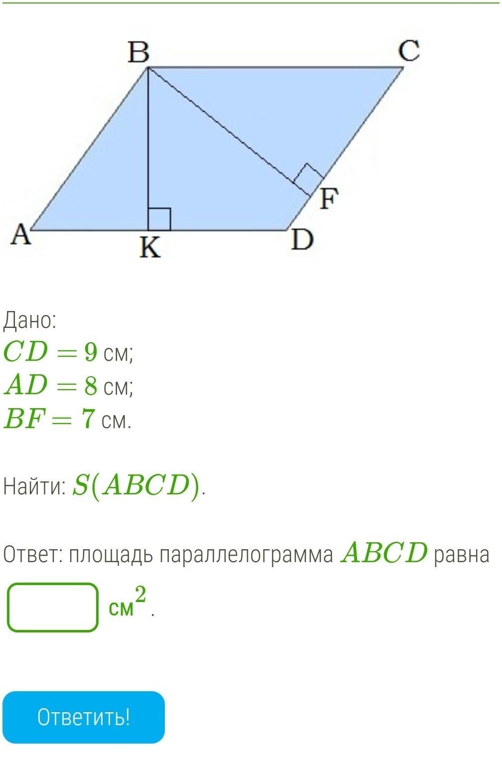 S(ABCD) = CD • BF = 9 • 7 = 63 см².
