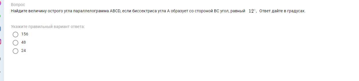∠A = 2 ∙ 12 = 24 ответ 24