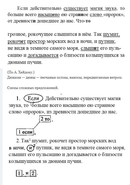 289. Спишите, подчёркивая грамматические основы сложных предложений. Расставь те пропущенные запятые, разделяющие простые предложения в сложном и выделяю щие обособленные второстепенные члены. Обозначьте паузы, которые выделяют обо собленные члены. Составьте схемы сложных предложений. Если действительно существует магия звука то больше всего насыщ. но ею стра (н, нное слово «пророк» от древност. дошедшее до нас. Что (то) грозное, рокоч. щее слышится в нём. Так шумит, рокоч. т простор морских вод в ночи и путник (не)видя в темноте самого моря слыш. т его пульсацию и догадывае..ся о близости колыш.щихся за дюнами* пучин. (По А. Хейдоку.)