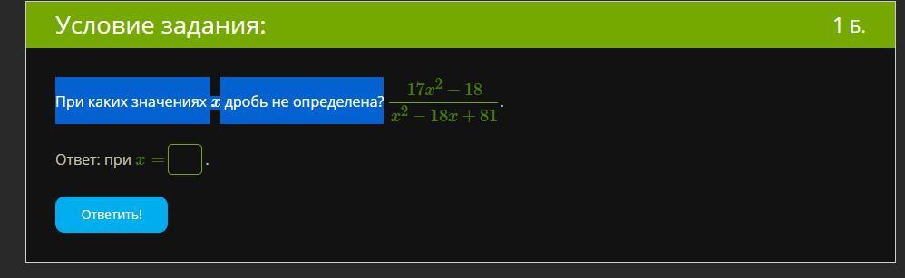 Приравниваем знаменатель к нулю и решаем уравнение: x²-18x+81=0 (Дискриминантом)