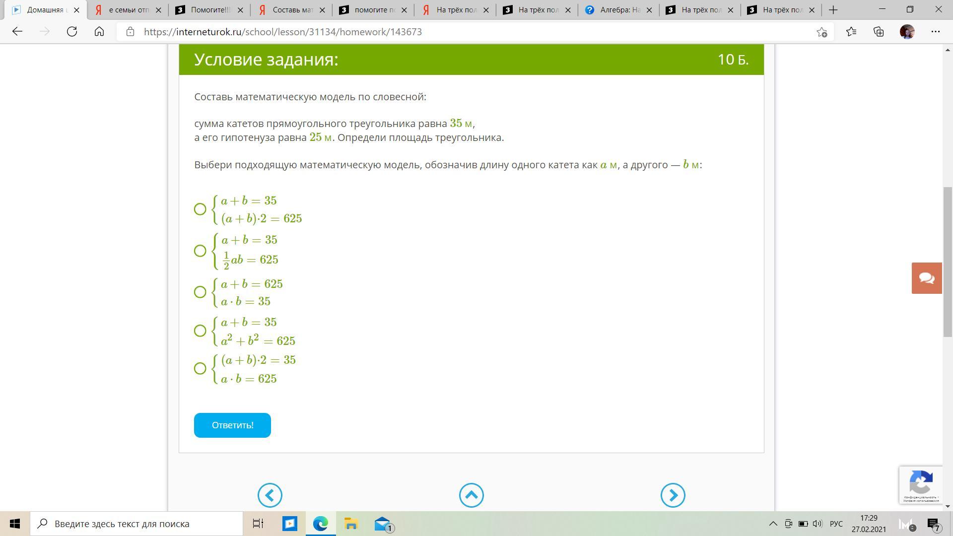 Выбери подходящую математическую модель, обозначив длину одного катета как a м , а другого — b м :