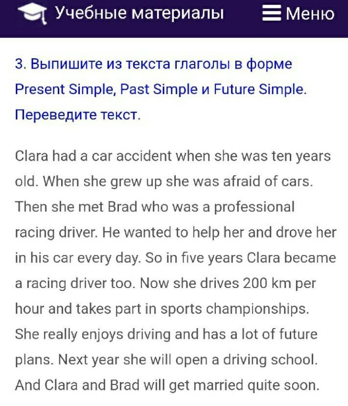профессиональным автогонщиком. Он захотел помочь ей и возил ее в своей машине каждый день. Через 5 лет Клара стала профессиональный автогонщиком тоже. Сейчас она водит машину 200 км/ч и принимает участие в спортивных соревнованиях. Она наслаждаться вождением и у нее много планов на будущее. Она откроет свою автошколу в следующем году. Клара и Брал скоро поженятся.