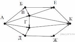 На рисунке — схема дорог, связывающих города А, Б, В, Г, Д, Е, Ж и К. По каждой дороге можно двигаться только в одном направлении, указанном стрелкой. Сколько существует различных путей из города А в город К?