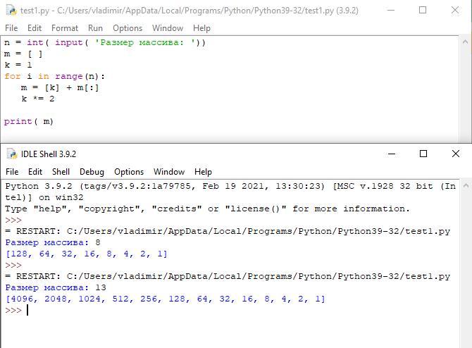 Python!!! используя цикл заполните массив степенями числа 2, начиная с конца так чтобы последний элемент массива был равен 1, а каждый предыдущий был в 2 раза больше следующего