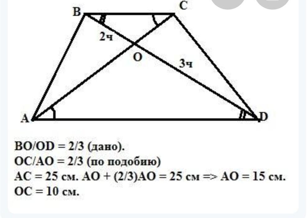 Треугольники ВОС и AOD подобны с коэффициентом подобия, равным отношению соответственных сторон, то ксть k = 2/3. =>
