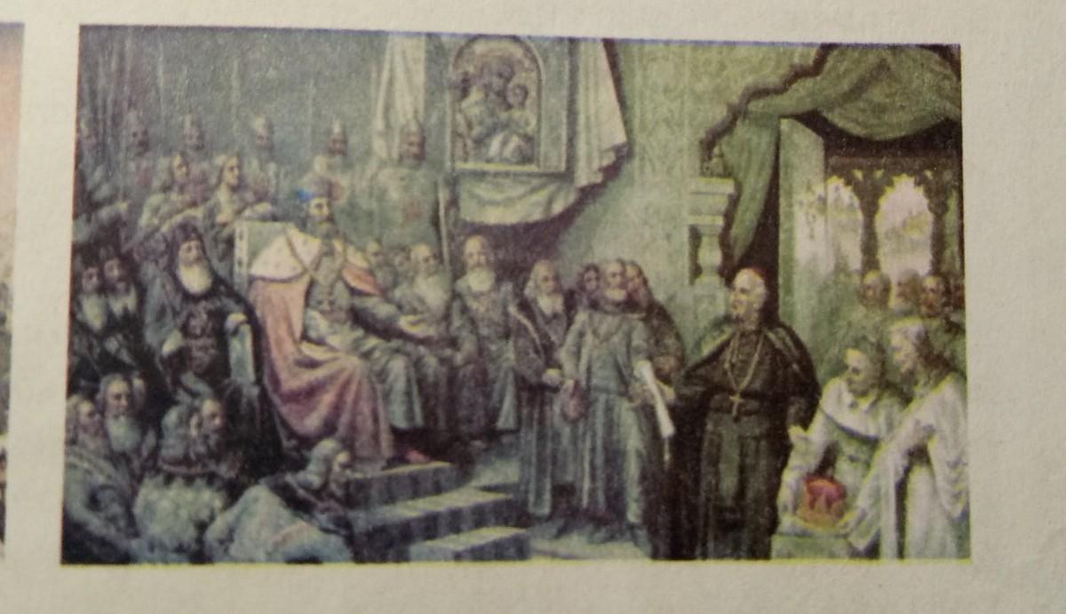 На фото изображенно, как чиновник идет к князю или царю с важной вестью, которая записана на бумаге. Такде вокруг мы наблюдаем толпу людей, которые тоже хотят услышать весть.