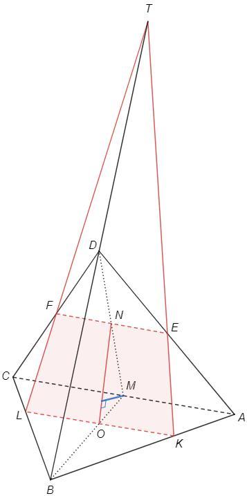 Прямые KE и LF - значит и плоскость (ОEF) - пересекают прямую DB в точке T так, что DT=DB.