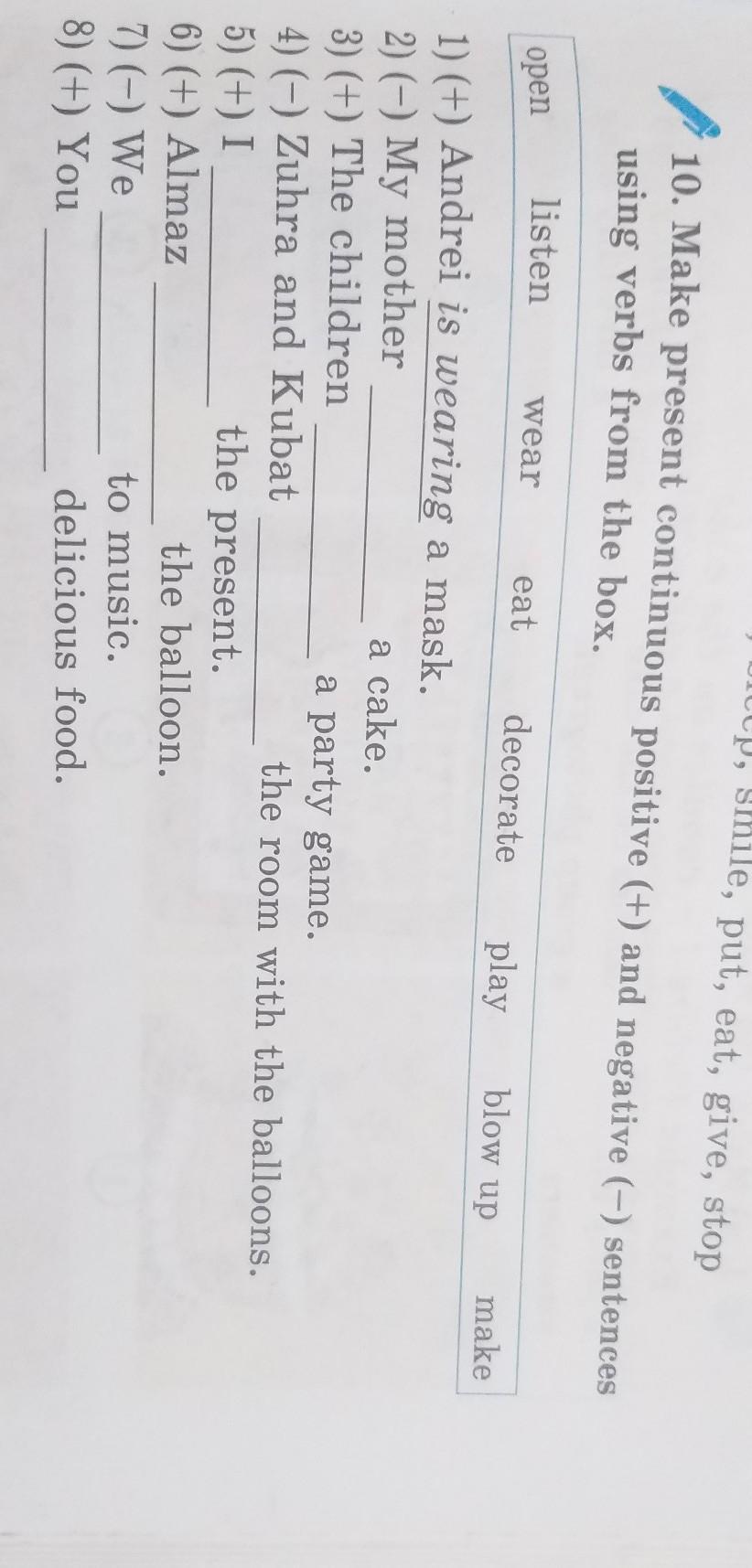 3)are playing 4) are not decorating 5) am opening 6) blowing up 7)are not listening 8) are eating