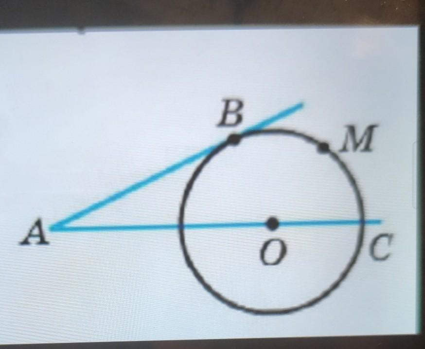 Через точку A, яка лежить поза колом із центром O, проведено дві прямі, одна з яких дотикається до кола в точці B, а друга проходить через його центр. Відомо що дуга BMC =100°. Знайдіть кут BAC.