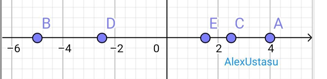 Точки A (4); B (-5); C (2,5); D (-2,5); E (1,5) на координатной прямой ниже.