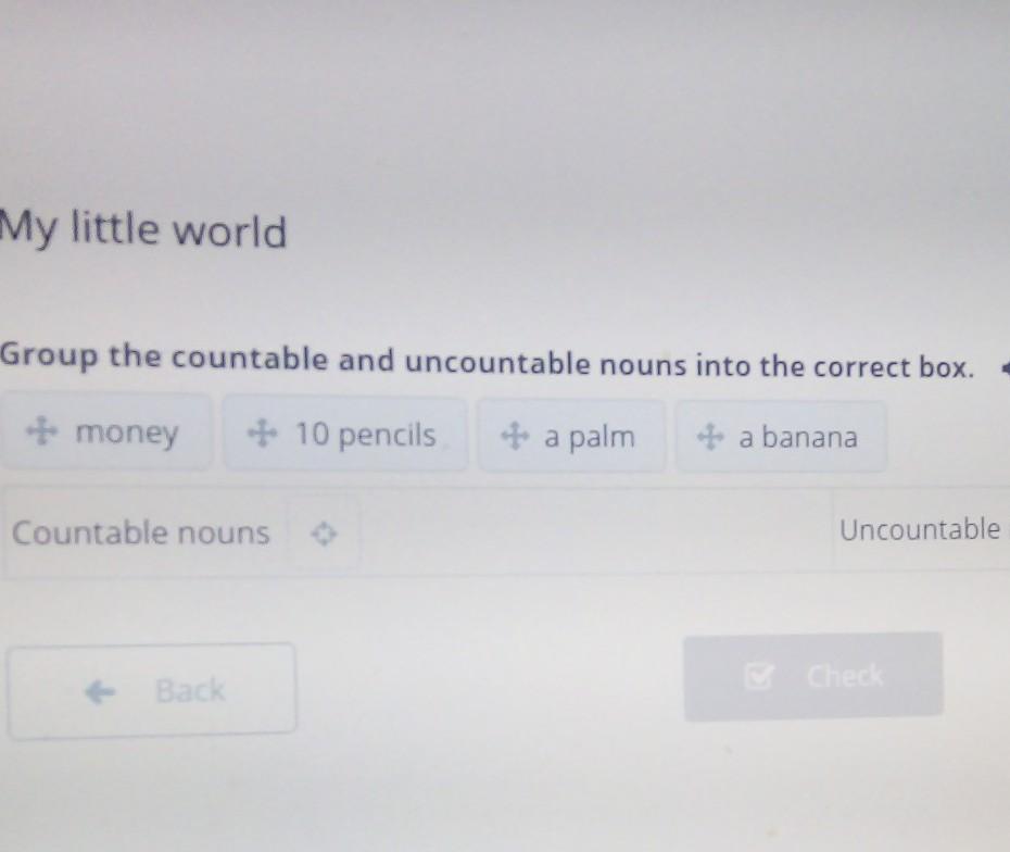 Group the countable and uncountable nouns into the correct box. •